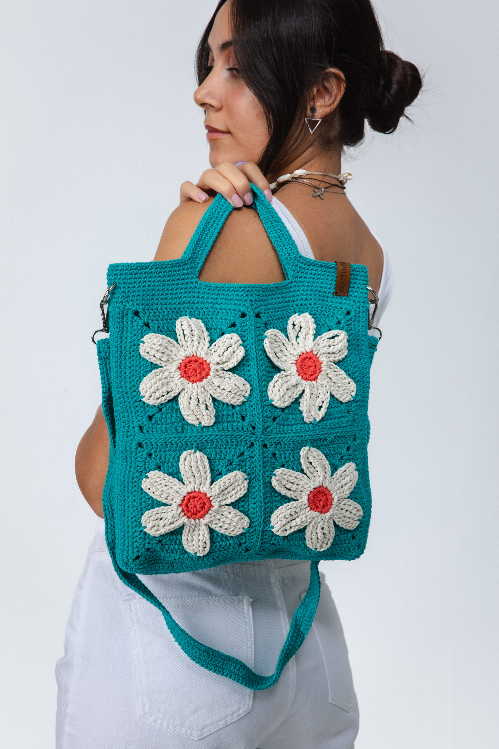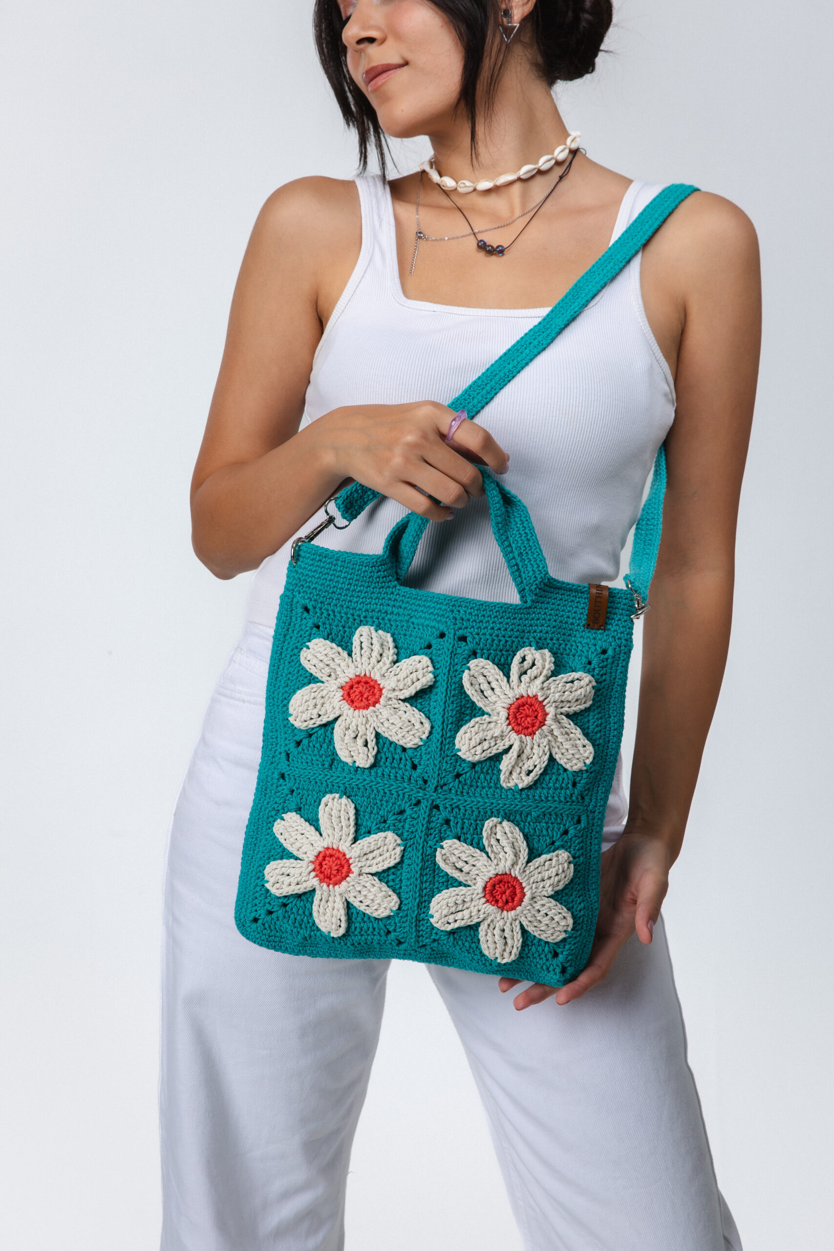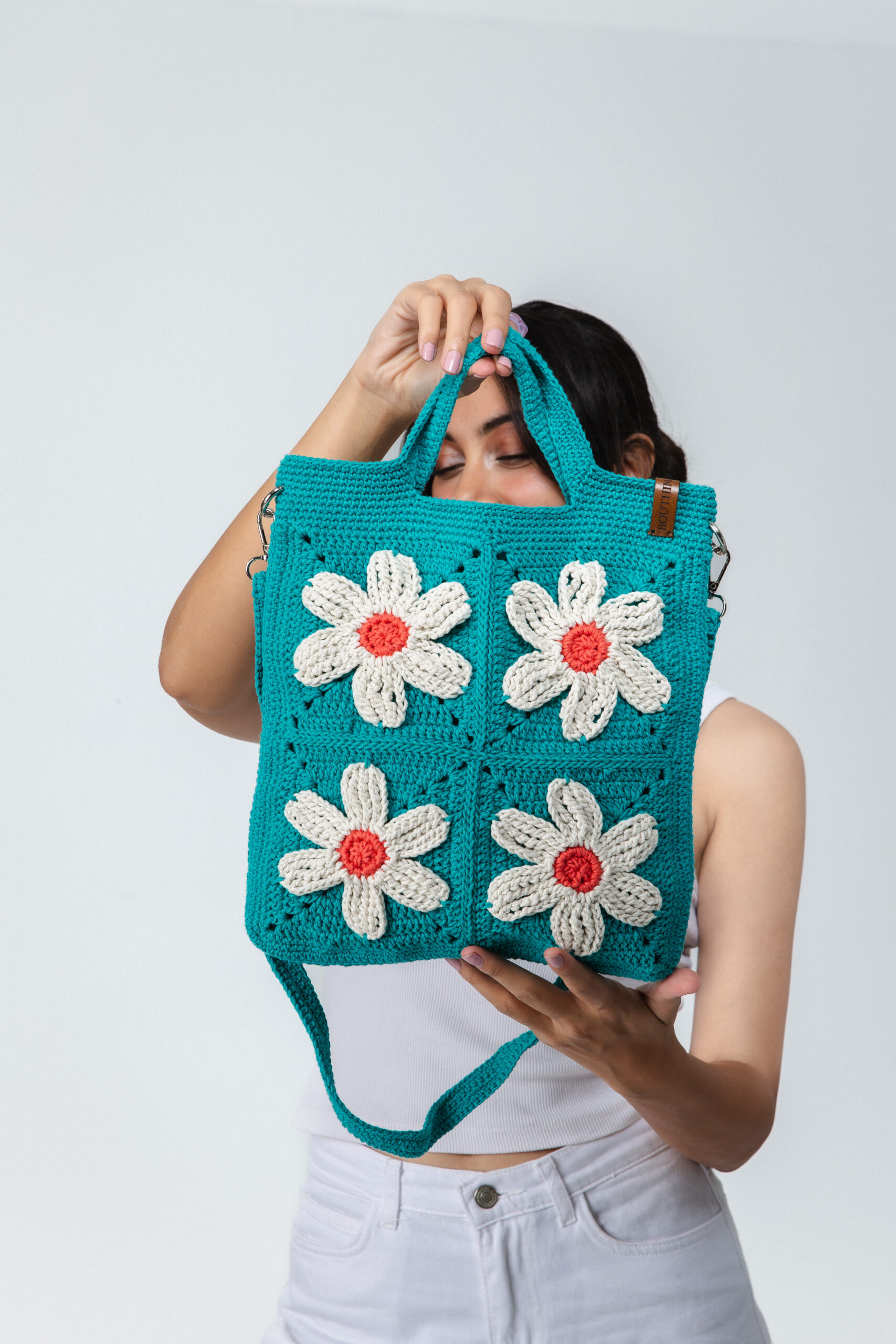 • A stylish handmade crochet bag, beautifully decorated with 3D flowers for a bold and eye-catching look.