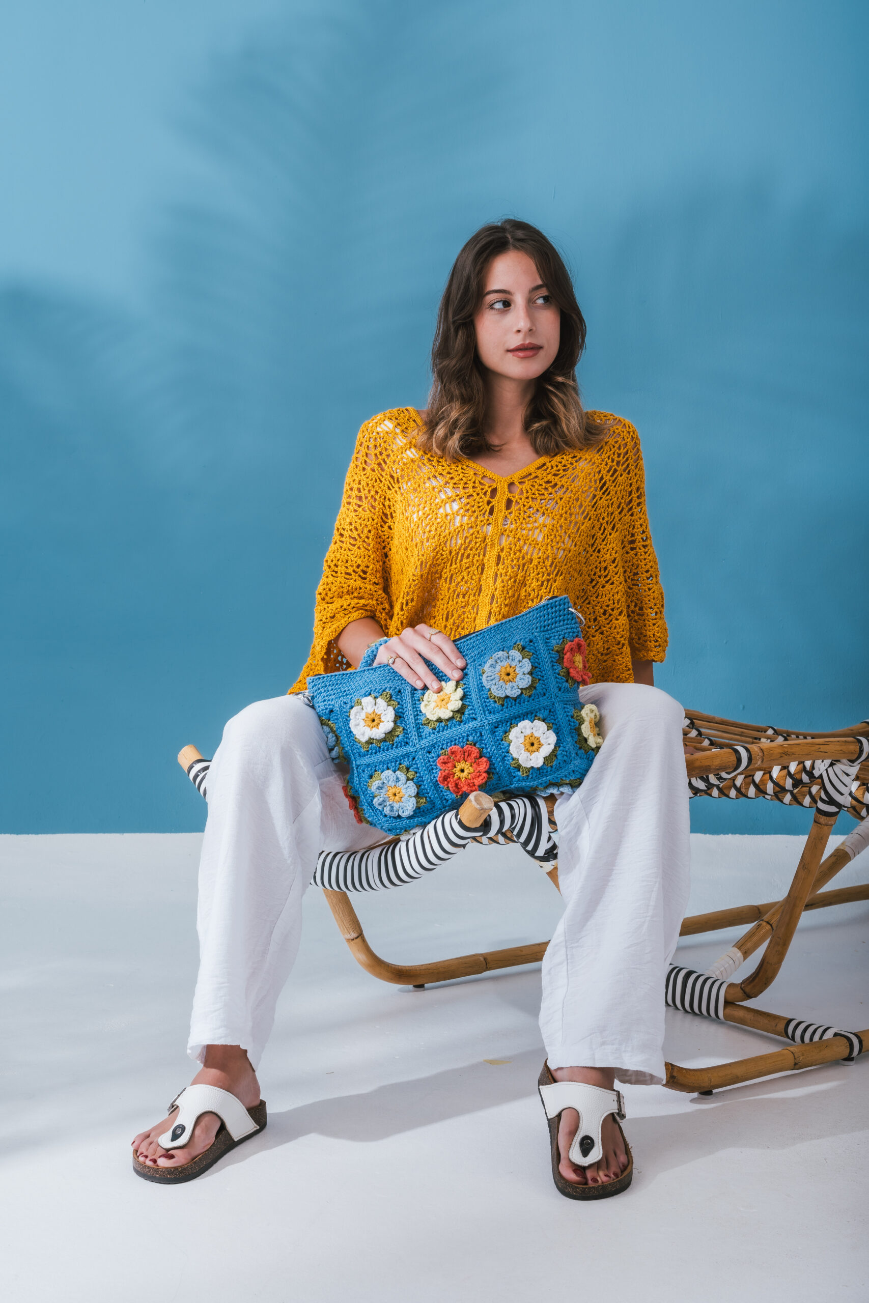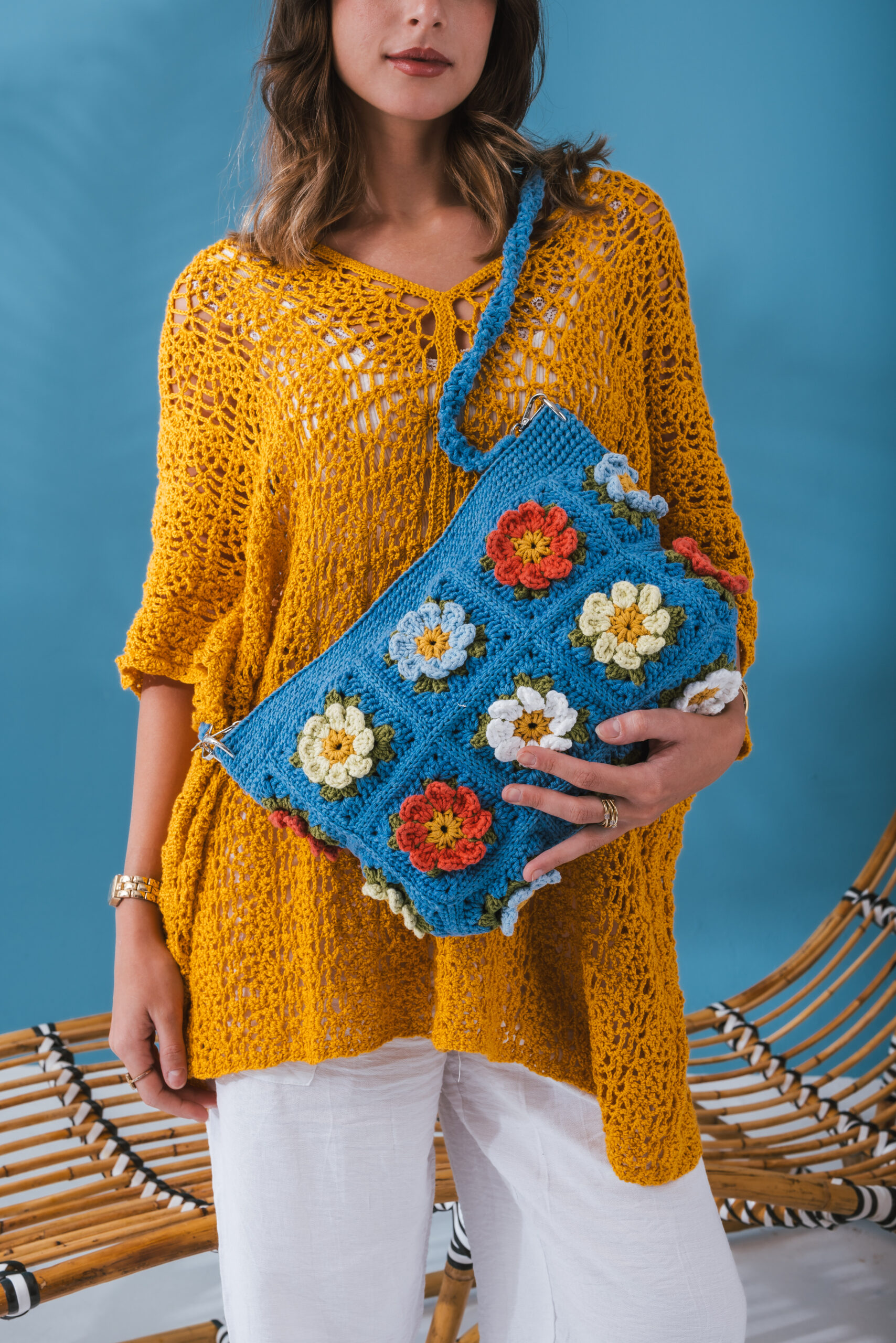 • Handmade cotton clutch adorned with vibrant 3D flowers, bringing a colorful and artistic touch to any look.