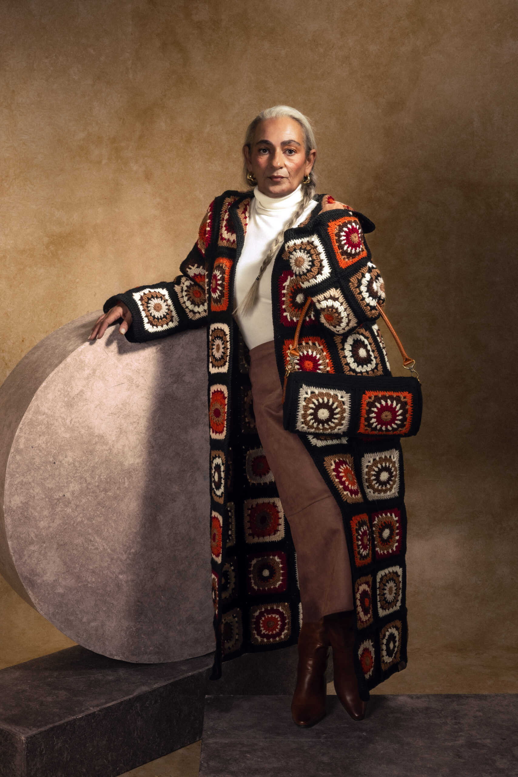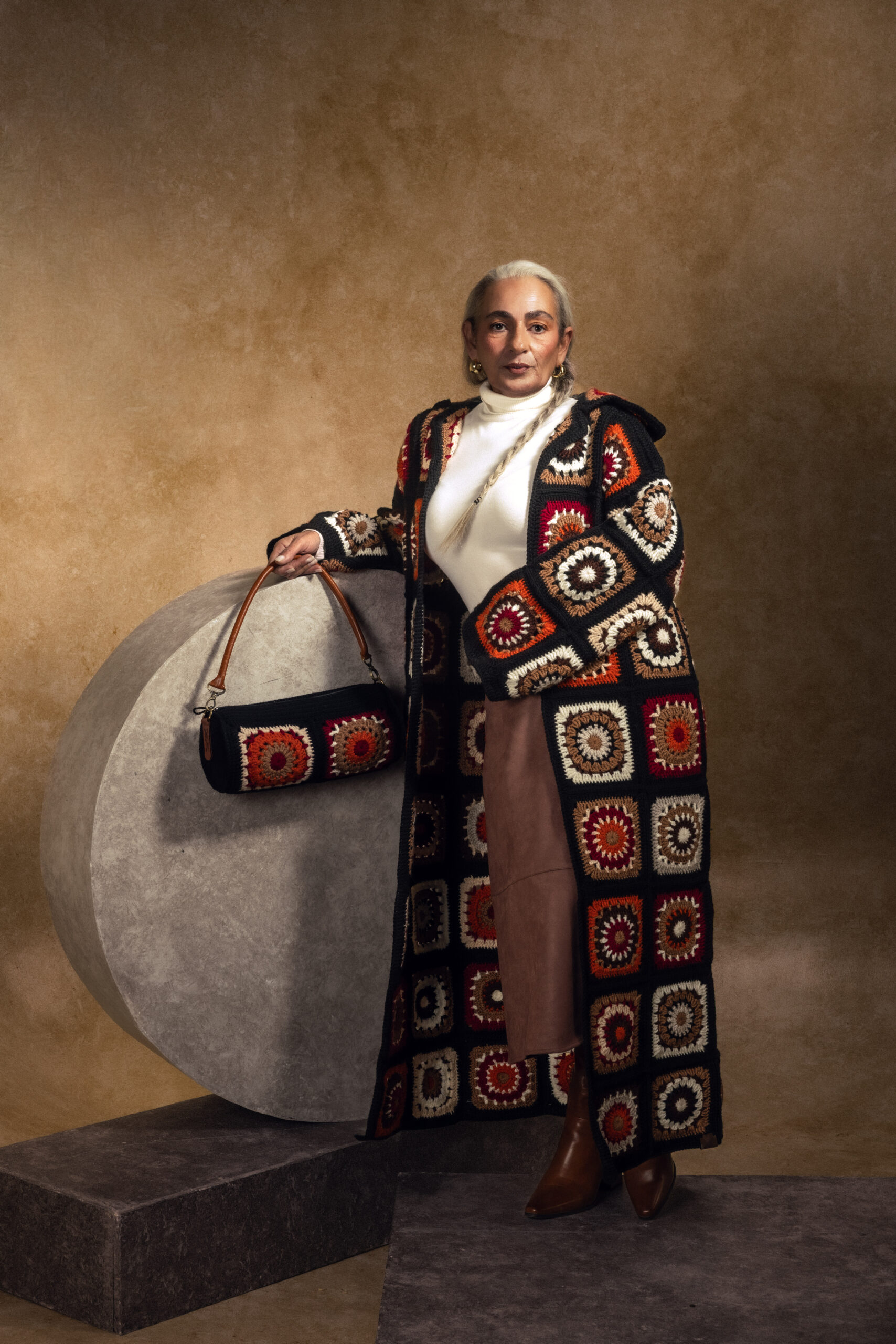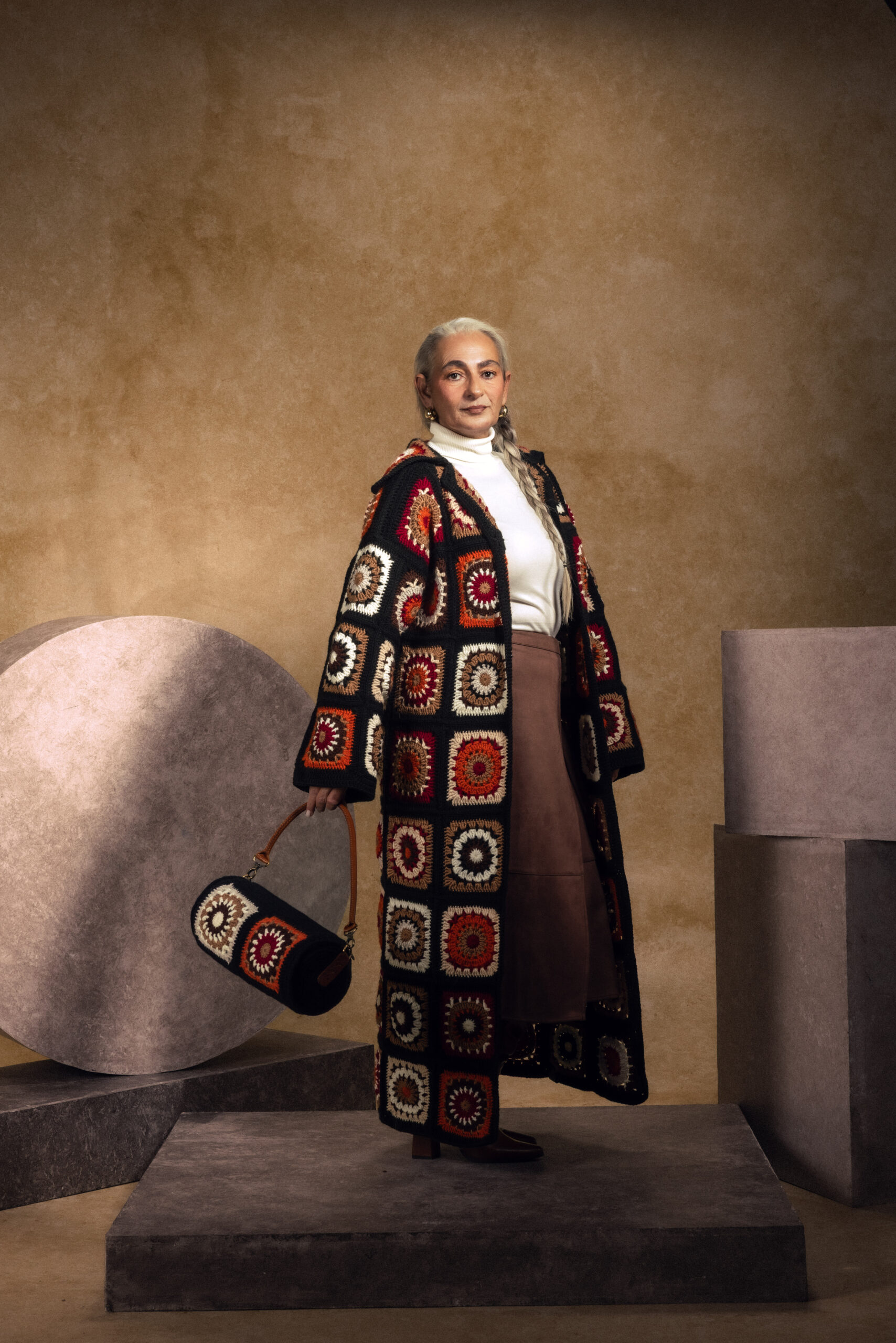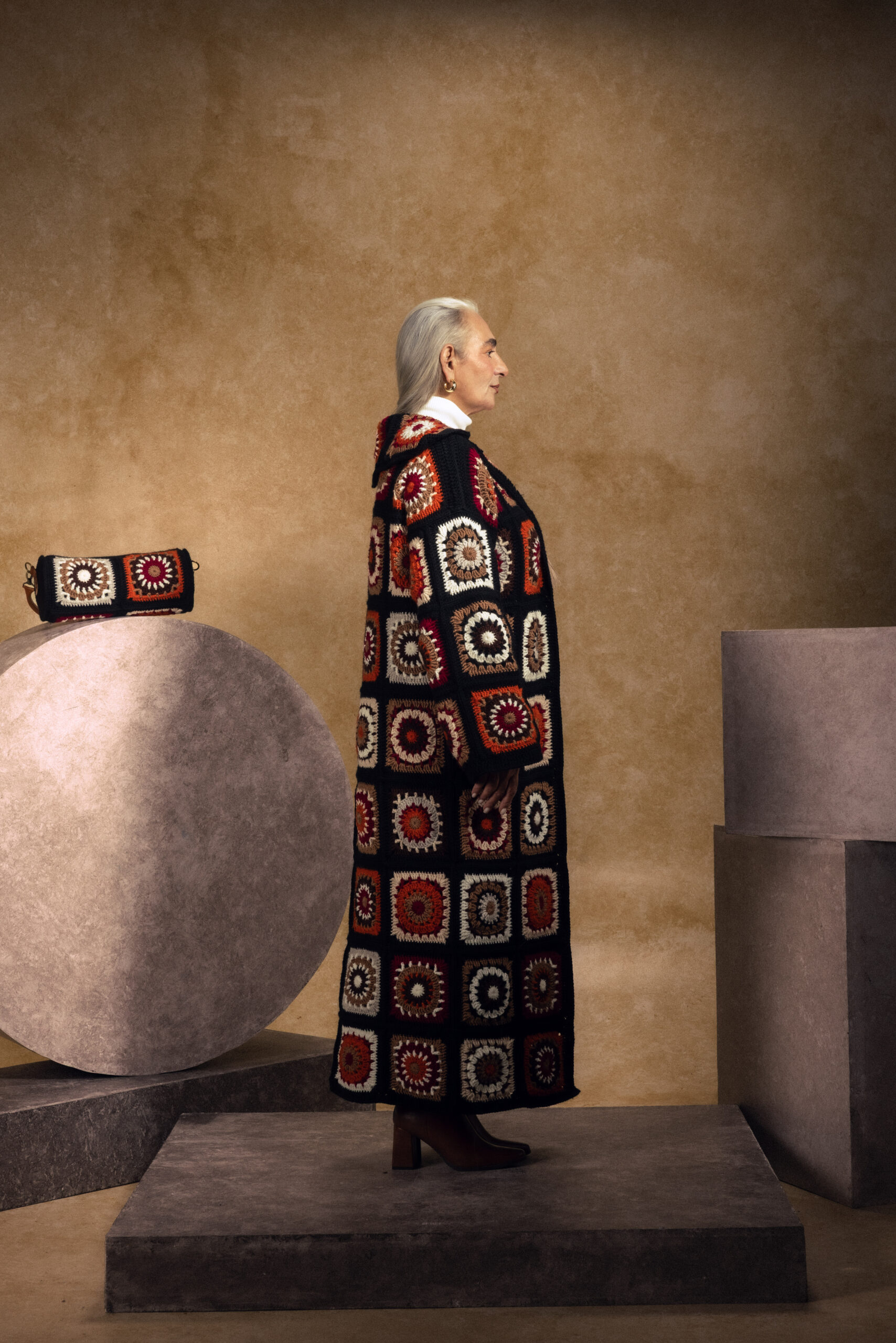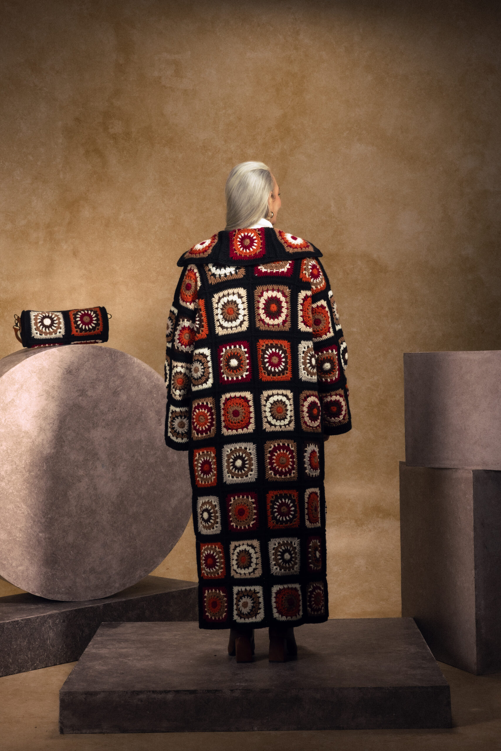 - A luxury handmade long coat with a matching crochet bag, created in small batches using traditional techniques.